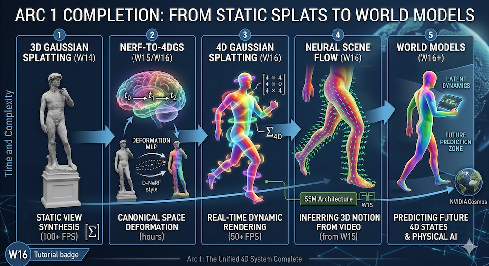 This week closes the first arc: W13 asked how AI should model the world (latent dynamics, world models) → W14 showed what to render (Gaussian splats) → W15 determined which architecture powers it (SSMs and beyond) → W16 addresses what every scene model must handle: time and motion.