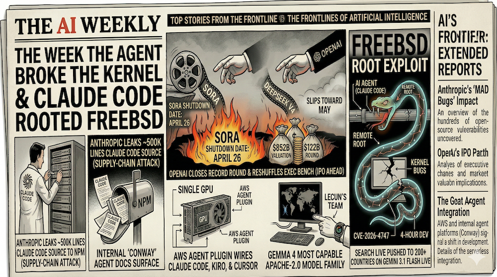 Week in Review | The week the agent broke the kernel: Claude Code autonomously wrote a working remote root exploit for FreeBSD (CVE-2026-4747) in four hours as part of Anthropic's MAD Bugs month, which has already surfaced 500+ zero-days in OSS. OpenAI closed a record $122B round at an $852B valuation and reshuffled its exec bench ahead of a possible Q4 IPO. Google made Gemma 4 the most capable Apache-2.0 open model family yet, and pushed Search Live to 200+ countries on Gemini 3.1 Flash Live. Anthropic also leaked ~512K lines of Claude Code source to npm during a coordinated supply-chain attack, while internal docs on its always-on "Conway" agent platform surfaced. OpenAI confirmed an April 26 shutdown date for Sora; DeepSeek V4 slipped again toward May; and AWS shipped an Agent Plugin wiring Claude Code, Kiro, and Cursor into serverless development.