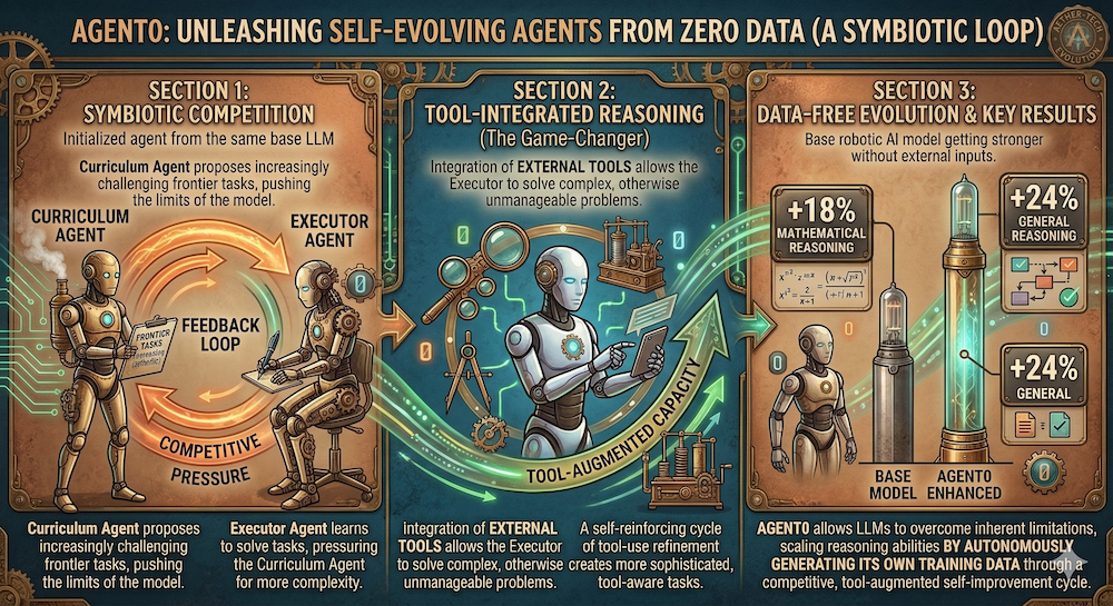 A recent paper called Agent0 (OpenReview), presented as an Oral paper at the ICLR 2026 RSI Workshop, shows how to build a self-evolving agent starting from zero external data.